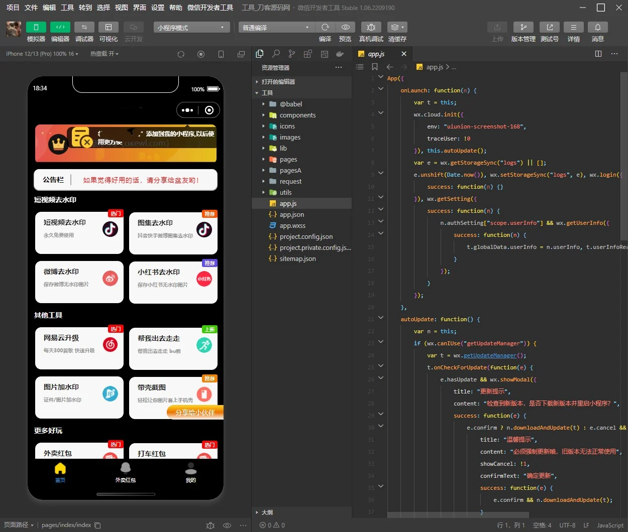色简约多功能工具箱去水印外卖流量主小程序源码 短视频去水印(抖音,快手等全网几十家平台都支持自带高速接口) 图集去水印一键保存(抖音,快手等全网几十家平台都支持) 网易云升级 微信等平台运动步数刷一刷 图片加水印(支持多种自定义模式) 带壳截图(支持多种模板自定义多种机型截图) 外卖CPS(如美团CPS,饿了么CPS) 打车CPS(如加油CPS,滴滴CPS,高德等CPS) 手机真伪检测(检查您的手机是不是正版等多项检测) 等等功能就不多说了,大家自行研究吧!